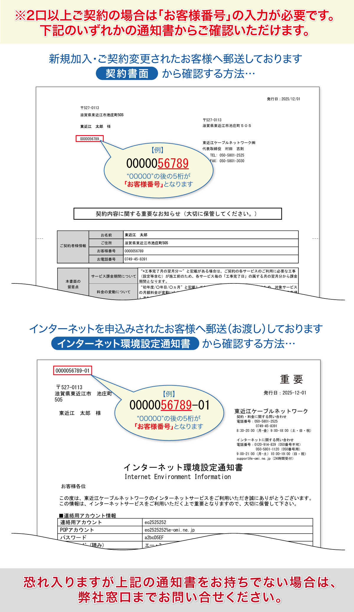 2口以上のご契約で上記情報が同一の場合は、「お客様番号」も入力してください。